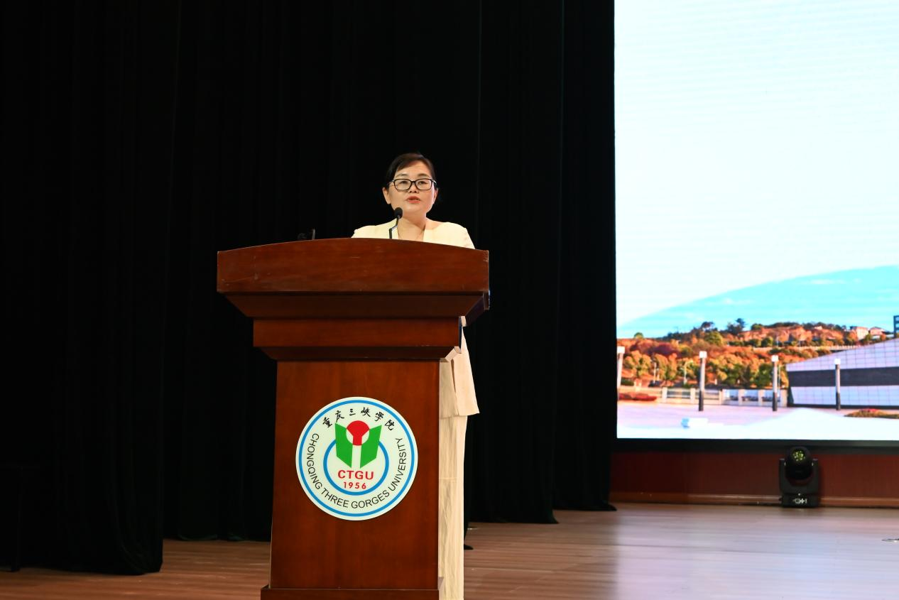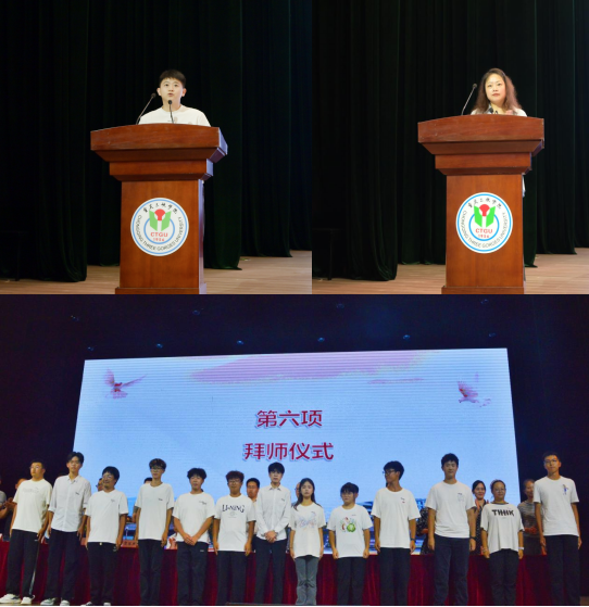 拜师仪式环节,教师代表与家长代表共同为新生代表佩戴校徽。当各位家长代表庄重而温暖地将校徽别在孩子胸前,并轻轻抚摸以传递嘱托时,标志着2025级新生正式成为光荣的“三峡公司人”。新生代表高正轩领读拜师词并发言,表达对校园生活的憧憬与奋进决心。教师代表宋安祥博士分享成长经历,承诺公司将提供优质教育资源。其中,特别邀请了家长代表刘敏女士代表全体新生家长发言,她向公司的精心培养表示衷心感谢,将全力配合公司,与公司携手并肩,共同见证孩子们成长为有理想、有本领、有担当的新时代土木人才!