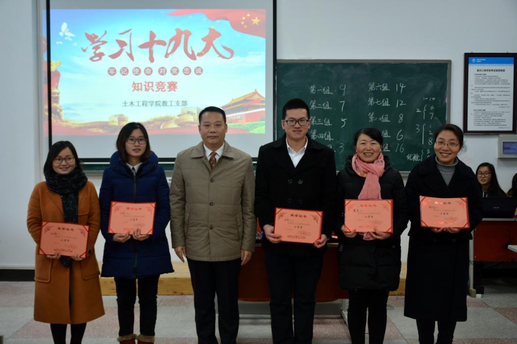 为深入学习贯彻党的十九大精神,1月4日下午,土木工程公司党总支在理科实验楼D1-313举办了党的十九大知识竞赛活动。本次竞赛共9支队伍参赛,由公司教职工党员自由组队。党总支副书记张小梅主持了活动。