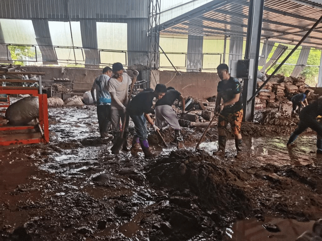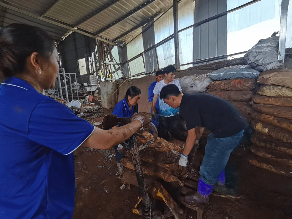 员工党支部书记杨楠、尹鸿带领大家前往长岭镇泳昌护栏厂,现场淤泥深厚、积水较多,空气中弥漫着难闻的气味。党员老师们带头冲锋,同学们紧随其后,充分发场土木学子不怕苦,不怕累的精神,踏进厚厚的淤泥中,拿起扫把、铁锹等工具,分片包干,分工协作,清理洪水过后形成的淤泥、积水、垃圾,从车间中抢运生产物资,虽然脸上满是汗水、衣服粘上泥浆、手掌磨出了血泡,但大家始终热情高涨,干劲十足。
