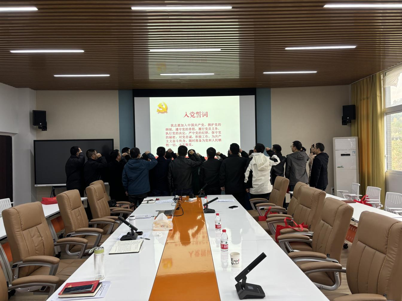 全体党员重温入党誓词,高举右拳,庄严宣誓:“我志愿加入中国共产党,拥护党的纲领,遵守党的章程……”。铮铮誓词、字字千钧,时刻提醒着每位党员不忘初心,进一步坚定忠诚履职尽责、服务员工的决心。