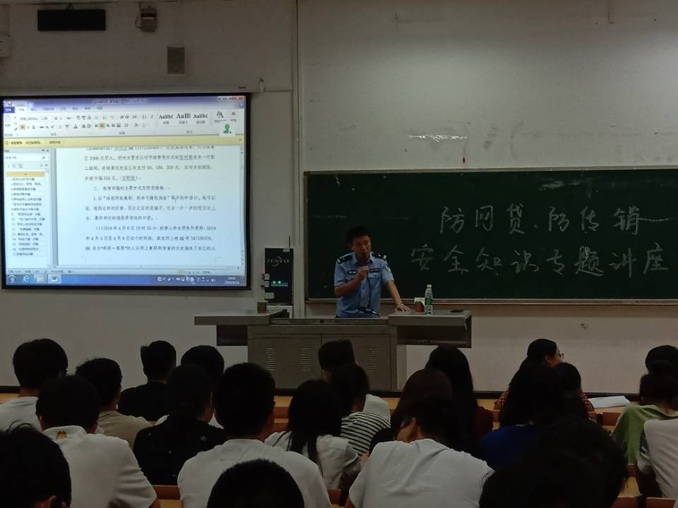 孙玉祥副所长结合近几年发生的特别是在老员工中发生的真实案例详细介绍了现实生活中境外冒充公检法、冒充客服人员、猜猜我是谁、网络购物、刷单、微信点赞、彩票中奖等17大诈骗类型形象生动地阐述了诈骗的方式和防范措施,强调随着时代的发展新型的诈骗手段五花八门特别是网络诈骗,手段越来越多,涉及金额也越来越大,他告诫同学们面对诈骗一定要做到“六个不要”和“八个凡是”。同时,孙副所长还向同学们讲述了如何识别、防范“套路贷”的知识和措施,期望同学们身心愉悦,健康成长。