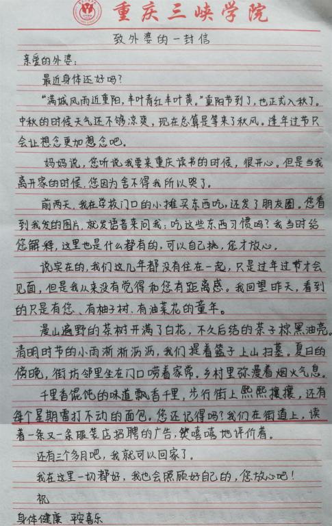 秋风徐徐,重阳九九,绵绵的思念飘向心底的人。书信承载着满满的思念之情被送往远方。这次活动向长辈们表达了来自同学们的思念与孝心,加深了同学们与长辈情感,同时也让同学们更加明白要弘扬尊老、敬老、爱老、助老的优良传统文化。金菊遍地花芬芳,思念之情更绵长。