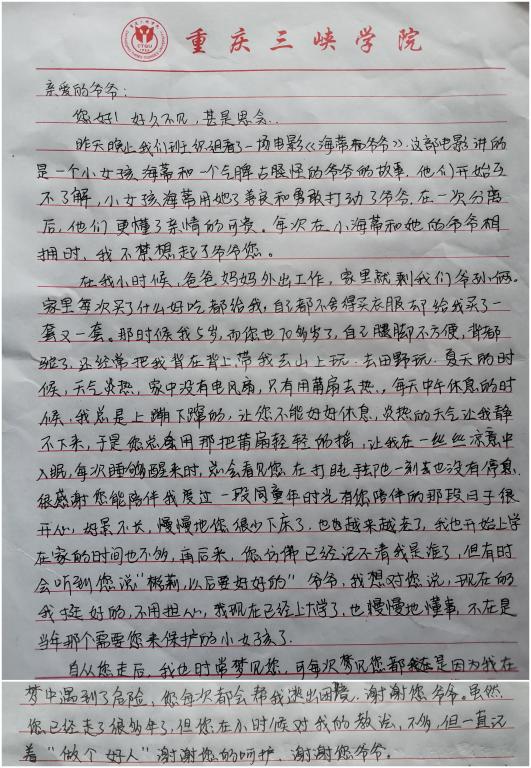 九九重阳凝聚了中华民族千秋万代“老吾老”的浓浓深情和生生不息的民族风范。为弘扬中华民族尊老、敬老、爱老的传统美德,10月7日,bevictor伟德官网院团总支举办了“孝似朝阳•信在重阳”的主题观影活动,2019级全体同学观看了电影《海蒂与爷爷》并写信给自己最思恋的长辈。