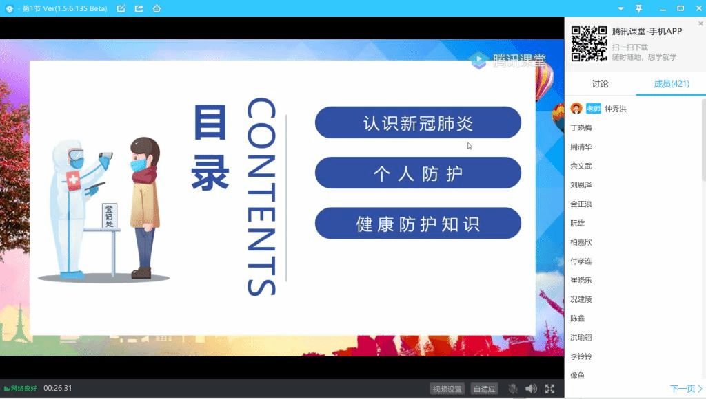 钟秀洪医生首先介绍了新冠肺炎疫情在国际国内的爆发情况和我国整体防控情况,分析了当前“外防输入,内防反弹”的形势,提醒大家不恐慌、不松懈;从“认识新冠肺炎”、“个人防护”、“健康防护知识”三方面深入浅出讲授了新冠病毒的特性、传播规律及感染致病原理,并就居家、返校和返校后如何做好疫情防控和个人防护做了详细指导,提议全体同学一定要按照教育系统、公司要求做好健康防护;传授了个人防护的四大法宝——“勤洗手、常通风、戴口罩、不扎堆”,并倡导大家做到生活规律、适度运动、均衡营养,以积极的心态迎接返校复学。