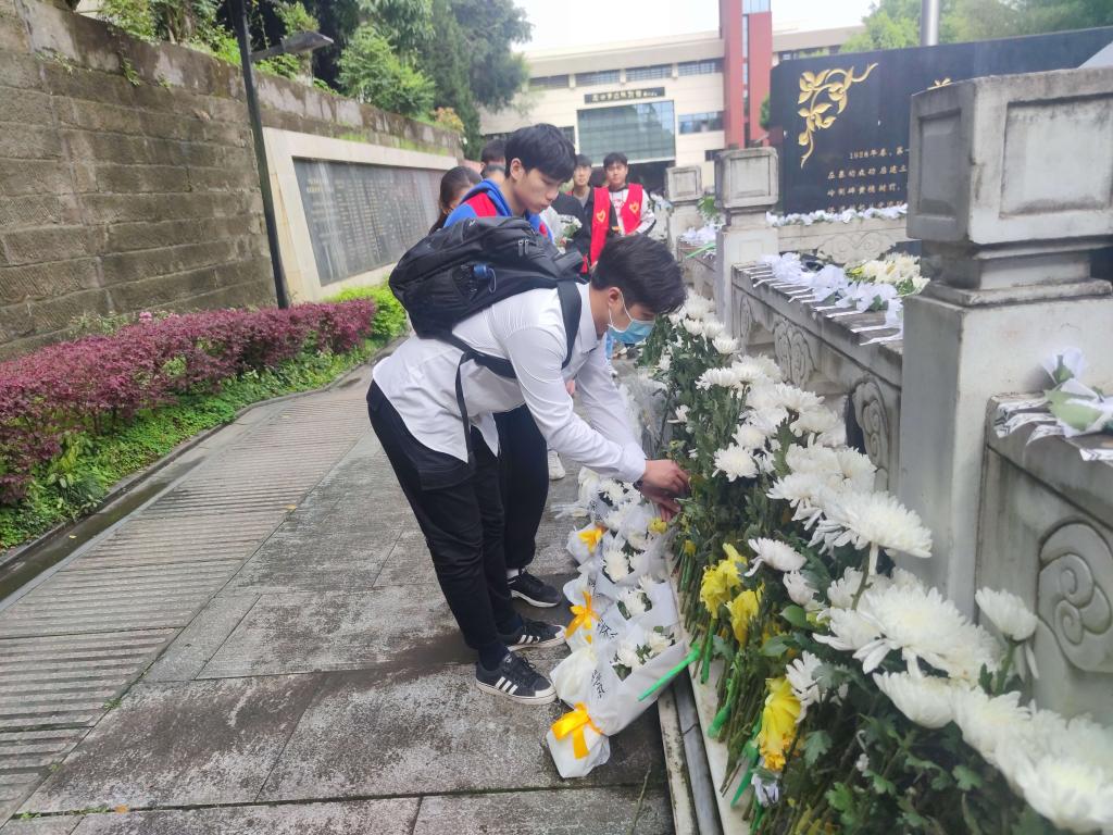 烈士陵园中,同学们手持白菊花,面向先辈集体默哀。在烈士陵园的国旗下,洪鹏带领大家重温历史,生动地向同学们讲述了中国共产党建党一百年来筚路蓝缕、春华秋实的光辉历程,教育同学们不忘老一辈无产阶级革命者为之流血牺牲的伟大理想,要以革命先辈为榜样,传承红色基因,继承党的优良传统,在新时代勇当先锋。