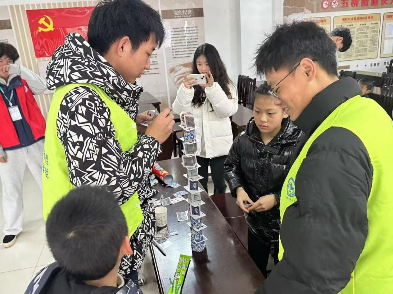 活动现场,志愿者与孩子们“一对一或一对多”分组结对,帮助孩子们耐心地完成数学、语文等课后作业习题,有效提升了孩子们的学习兴趣和作业完成质量。随后,建筑协会的同学们讲解了有关建筑结构的知识和纸牌搭桥的原理,并且利用扑克牌进行类比土木工程专业在建筑结构中的应用,并带领孩子们学习搭建结构的方法。在志愿者的帮助与引导下,孩子们充分发挥想象力,顺利搭建起了一个又一个的独特扑克塔桥。