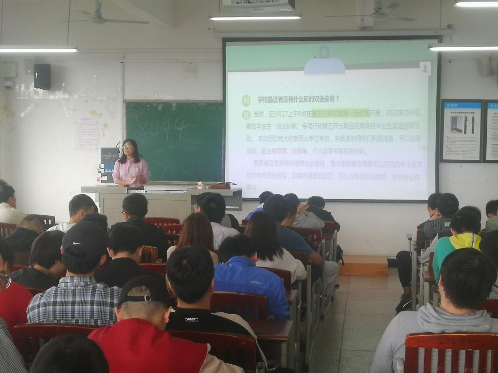 辅导员刘艳玲对专项招聘、应征入伍、西部计划、三支一扶等基层就业项目做了宣讲动员,鼓励未就业员工树立家国情怀,主动到艰苦地区和行业建功立业。详细介绍了2022年万州区高校毕业生“就业护航”专项行动暨万开云联合招聘高校毕业生专场招聘活动。