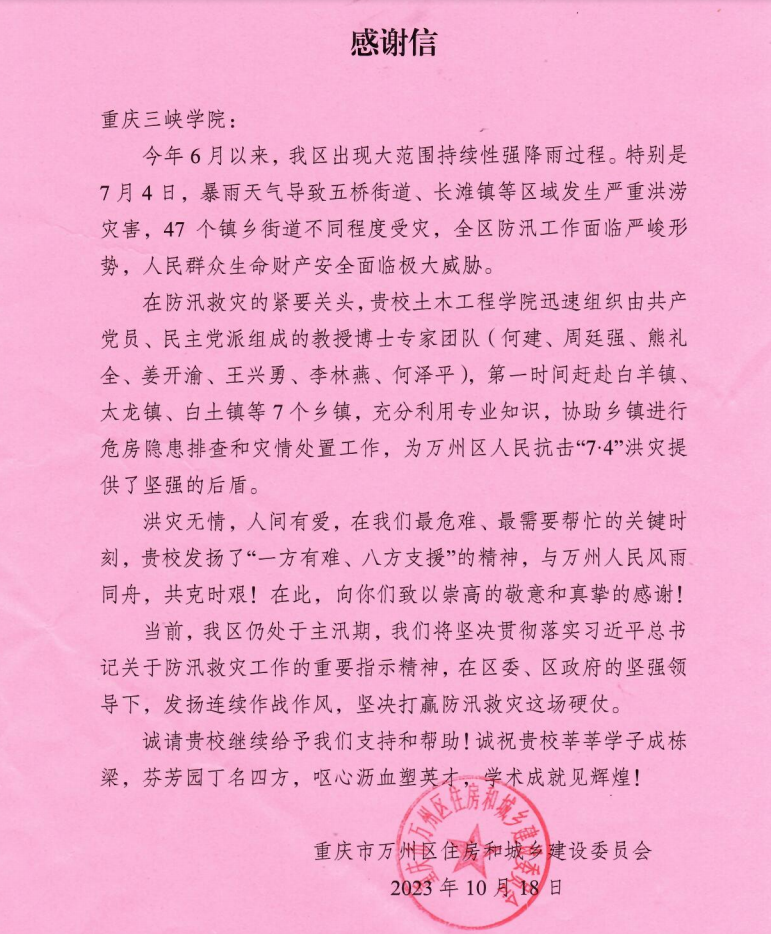 近日,公司收到了一封来自万州区住房和城乡建设委员会的感谢信,对bevictor伟德官网院教师何建、周廷强、熊礼全、姜开渝、王心勇、李林燕、何泽平等同志参加防汛救灾行动表示由衷的感谢和高度的赞扬。