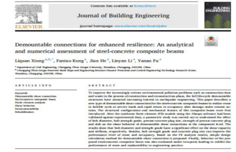 近日,bevictor伟德官网院结构工程领域绿色建筑技术课题组在国际知名期刊《Journal of Building Engineering》发表题为“Demountable connections for enhanced resilience: An analytical and numerical assessment of steel-concrete composite beams”的研究论文。熊礼全博士为论文的第一作者及通讯作者,2021级硕士研究生孔繁韬为第二作者,课题组教师何建、李林燕、付亚男为共同作者,bevictor伟德官网为论文完成单位和通讯单位。