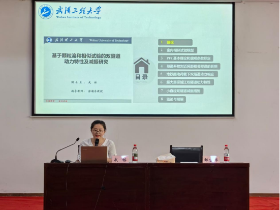 会上,武林博士首先介绍了自己和团队的情况以及她的科研经历和学术成果。武林主持国家自然科学基金项目1项,以第一作者/通讯作者发表论文12篇,担任多个高水平期刊审稿人。随后,武林针对双隧道动力特性及减振方面进行了详细精彩的阐述。主要从隧道开挖对近间距相邻隧道的影响、地铁振动荷载下双隧道动力响应、超大直径越江双隧道动力特性和小直径双隧道减振措施四个方面详细展开。同时指出研究的创新点在于建立三维动态颗粒流模型和采用了定量分析方法。最后总结研究的主要结论,提出研究展望。