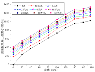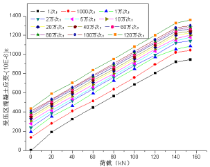 从图6~7可以看出,初次加载以及疲劳加载1000次时,各个梁跨中挠度与荷载的增长基本上呈现线性变化规律,荷载幅值与疲劳的影响不明显。从图8~12可以看出,三个梁的起点都向上进行了移动,说明残余挠度增加比较迅速,从挠度也间接说明开始疲劳损伤积累比较快,三个梁的挠度数值曲线慢慢开始分散,且在同等荷载下荷载水平较大的梁挠度较大,说明实验梁的荷载水平对梁的影响随疲劳循环次数的增加变的越来越明显。