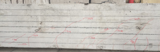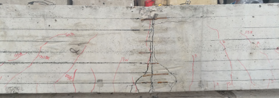 梁破坏时,全梁发现裂缝37条;竖向裂缝延伸至受压区顶部;受压区混凝土被压碎;主裂缝最大宽度1.9mm。