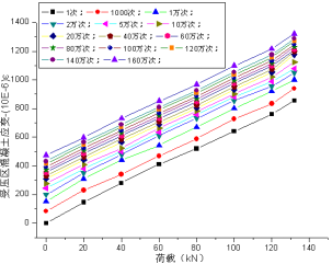卸载至 0,然后对各采集装置进行调零处理,将百分表放置好,使指针与粘贴在梁体侧面的L型扣件充分接触。然后采集下0KN 状态下,结构的位移及应变信息。然后每隔20KN分级加载至疲劳荷载上限