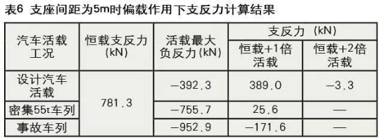 将本例桥梁端横梁支座间距调整为5m,此时汽车活载作用线位于两支座间,按照刚体进行计算的抗倾覆稳定系数为+∞,偏载作用下支座反力计算结果如表6所示。可见支座活载负反力大幅减小,即使在密集55t车列作用下,该支座也不脱空。