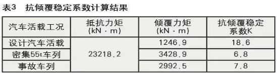 在公路-I级、密集55t车列和事故车列三种荷载工况作用下,该桥按照刚体进行计算的抗倾覆稳定系数结果详见表3。从表中可知,设计活载作用下,该桥的抗倾覆稳定系数达到18以上,即使在密集55t车列或事故车列的作用下此系数也均在6以上,并且事故车列的总重量小于密集55t车列的重量(412.5t)。