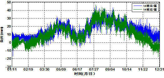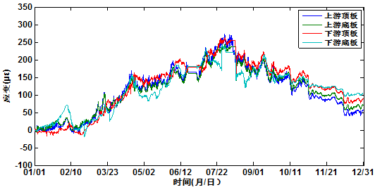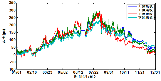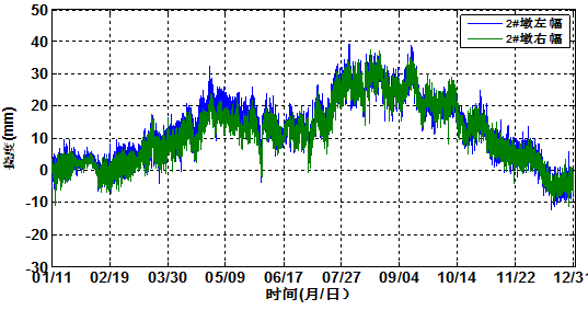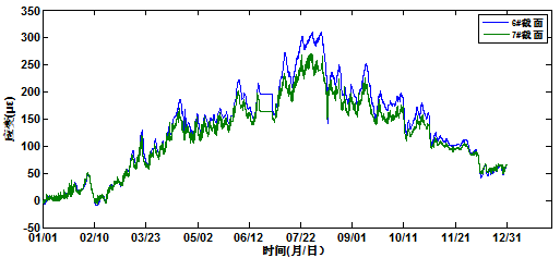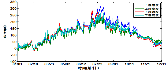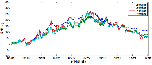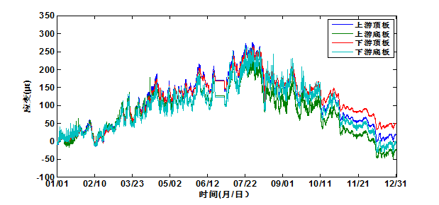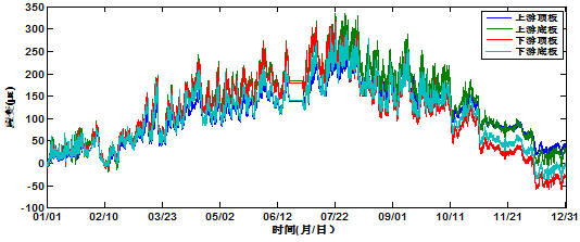 (3)从全桥全年各测点的温度数据来看,均没有明显的日温差效应,即在24小时内温度有显著改变,这主要是由于温度传感器均安装在桥梁箱梁内部,而混凝土为热的不良导体,太阳的日温差未能影响到箱梁内部。