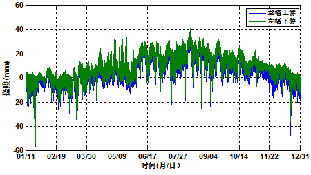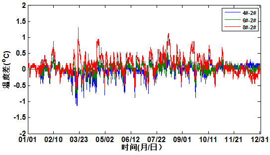 从图15至16可知,在左、右幅桥梁,沿纵桥向温度测点的差值在绝大多数时间内小于±0.5℃,考虑到温度测试受精度以及噪音影响等因素,可以认为沿纵桥向桥梁的温度是均匀分布的,这与现有大多数监测系统所得结论一致。