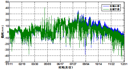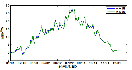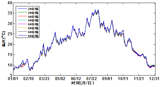 大桥箱梁内8只温度传感器从2014年1月1日至12月31日的温度数据如图14所示。将这8只传感器分为左幅、右幅分开作图。(具体曲线见报告)