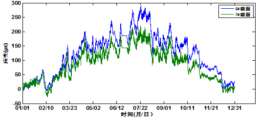 (1)从1月份到8月份,箱梁内的温度从8.1℃上升到36.6℃;从8月份到12月份,箱梁内的温度从36.6℃下降到7.3℃。在2014年1月至12月这一监测时段内,重庆的气候从冬天转入夏天,再从夏天转入冬天,故大气温度变化是先升温、再降温度,这一变化趋势与温度监测曲线的变化趋势相符;