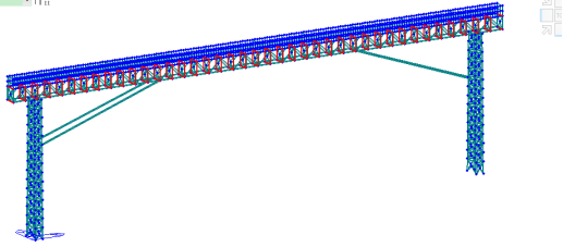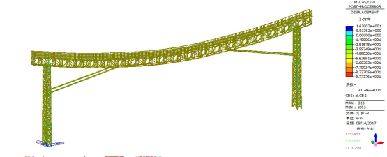 采用有限元计算程序midas/civil 2012建立灯桥在垂直荷载、配重、风荷载预拉力等荷载作用下的计算模型,如图13-图14所示。