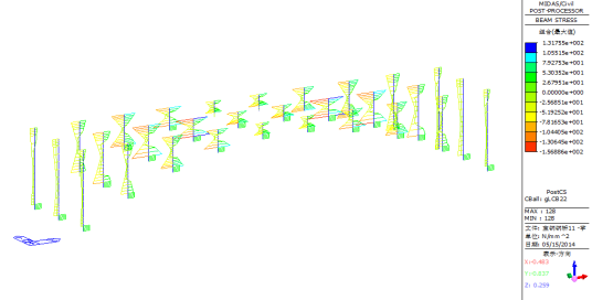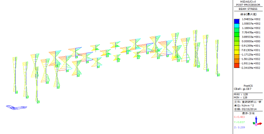 建模采用midas/civil2012有限元分析软件,按设计材料类型和截面尺寸建模分析弹性阶段最不利荷载工况下成桥阶段及施工阶段的受力性能;拱肋采用组合截面中的一般截面,梁单元建模,拱肋横撑、立柱及盖梁均采用梁单元建模,桥面板通过虚拟横梁等效为梁格体系,桥面板两端按简支梁体系连接;由于拱脚坐落在原桥基础上,可认为地基状况良好,拱脚均采用墩底固结形式;成桥阶段共划分为421个节点,601个单元,全桥离散图如下所示: