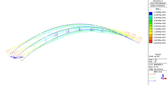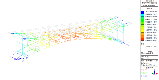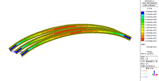 图28成桥阶段偏载2列车工况下全桥一阶屈曲模态(稳定系数:41.01)