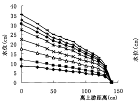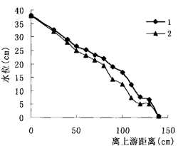 图5是尚未形成管涌通道之前砂层顶面测压管水头的分布情况。试验中反复测量可知,未形成管涌通道之前,仅堤后发生砂沸,砂层在各级水头下稳定渗流,同一级水头下,布置在砂层顶面的测压管读数以及堤基渗流量几乎保持不变。一旦管涌通道形成,同样保持水头不变,但随着时间的延长,测压管水头线逐渐降低,管涌通道沿水头线较陡处水力坡降大渐渐往上游发展,砂层内部水头逐渐调整,至渗径长度满足水头线调整之后堤基坡降不超过临界坡降时,又达到一个稳定状态,通道发展至某一位置后停止,管涌自愈,如图6所示,水头线由回落变化至。水头达到一定高度后,通道往前发展加速,测压管读数渐渐回落,至管涌通道贯通时,测压管读数起伏较大,大量水砂由下游渗流出口汹涌而出,管涌破坏。时间更短,也更容易发生管涌溃堤事故。