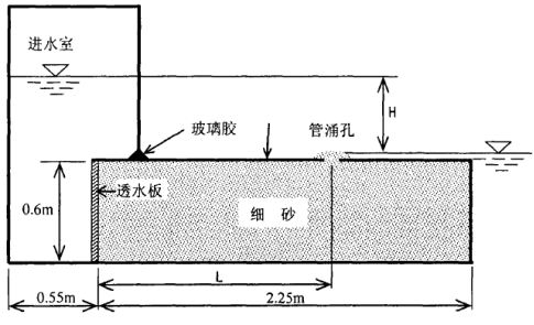 砂模型长,宽,高,砂模型制作方法与单一砂层透水地基试验相同,不同的是,顶部的有机玻璃板长,将下卧砂层全部覆盖,四周用玻璃胶密封止水,仅在中线上距上游进水口处预留一直径的圆孔出流,直通砂层。其中,有机玻璃板模拟堤身和弱透水的表土层,预留圆孔模拟汛期在堤后薄弱环节处形成的管涌孔。模型砂的性质同前。
