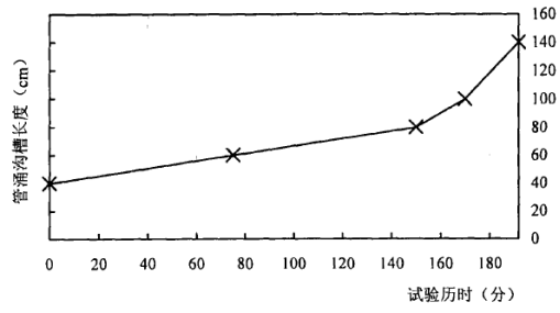 4.抬高水头至40.0 cm,管涌沟槽长度和渗流量呈加速增长的趋势,持续该级水头至75分钟时管涌沟槽长度增加到60 cm,150分钟时为80 cm,170分钟时为100 cm,192分钟时为140 cm(刚好与水箱连通),此时