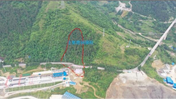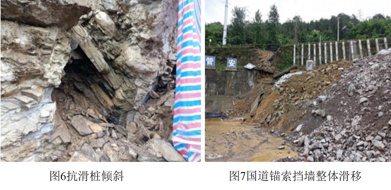 滑坡体位于单斜坡体上,斜坡坡向330~345°,坡度23-35°。斜坡岩层产状与坡向基本一致,且岩层倾角陡。岩性为页岩及砂岩互层,属易滑地层。滑坡体岩体裂隙发育,裂隙倾角大,长期的大气降雨致使层面和裂隙面受地下水浸润形成软弱面。万州环线高速公路建设在隧道施工挖断砂岩岩层形成临空面并且未及时支护,2021年5月3日强降雨使大量的雨水沿裂隙入渗至岩层,使之饱水软化,c、φ值降低,上部斜坡沿岩层层面产生顺层滑动,前缘应力集中后剪切破坏。在牵引作用下上部主滑动区发生顺层滑动。现场效果如图4至图7。