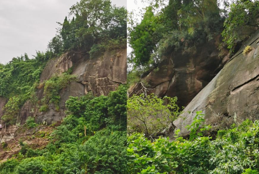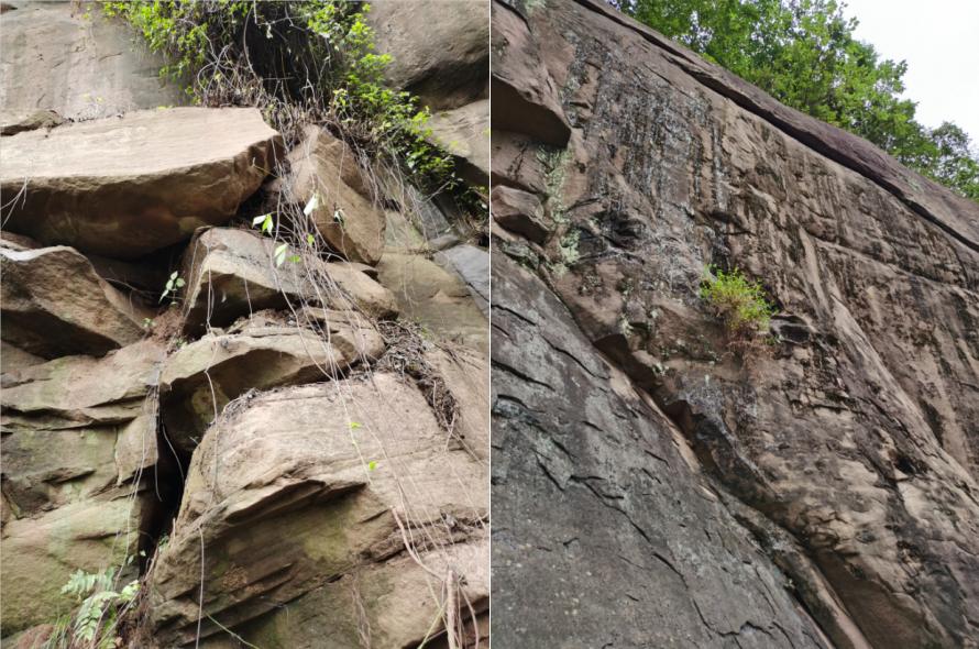 海事小区后侧危岩带凹岩腔发育,卸荷裂隙发育贯通;局部凹岩腔底部基座岩体松动崩落,基座泥岩压裂破碎,陡崖带分布大小不一的危岩块体。