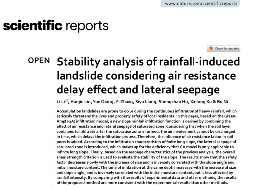 近日,公司强跃教授团队在国际知名期刊《Scientific reports》发表题为“Stability analysis of rainfall-induced landslide considering air resistance delay effect and lateral seepage”的研究论文。李莉副教授为论文的第一作者及通讯作者,2022级硕士研究生林涵杰为第二作者,课题组教师强跃、研究生张溢、梁思羽为共同作者,bevictor伟德官网为论文完成单位和通讯单位。